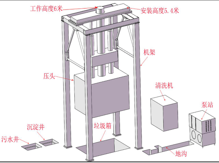 5)采用1條主壓縮油缸與2條副壓縮油缸并聯(lián)而成的壓縮油缸。可提高壓縮效率,降低設(shè)備高度,節(jié)約空間。
